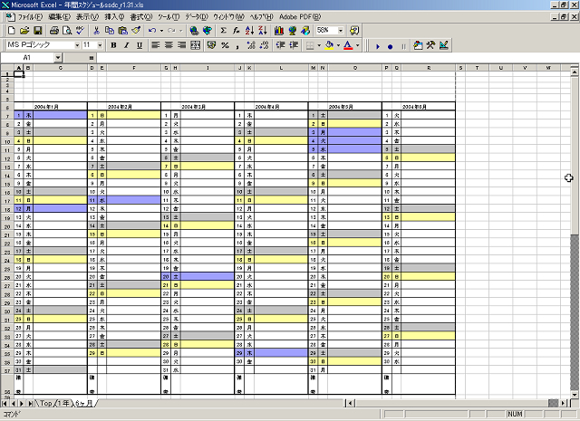 (スケジュール表への項目追加・削除について) *必ず作成したスケジュール表を別名保存するかコピーした後に行って下さい。 *「月間、年間スケジュール」本体上で行いますと以後正常に動作しなくなる可能性があります。 *別名保存・コピーに関しては次項を参考にして下さい。 (作成したスケジュールの保存方法) 1.スケジュールの作成後、[ファイル]→[名前を付けて保存]で別名で保存する。 2.スケジュールの作成後、保存したいスケジュールシートのシート名上で右クリック→[移動又はコピー] →[移動先ブック名]を指定→[コピーを作成する]にチェックを入れ[OK]を押します。 (用紙設定について) 本ソフトは、B版に印刷することを前提としています。 A版に印刷したいときは、Excel上の印刷設定で拡大等を行って下さい。 |