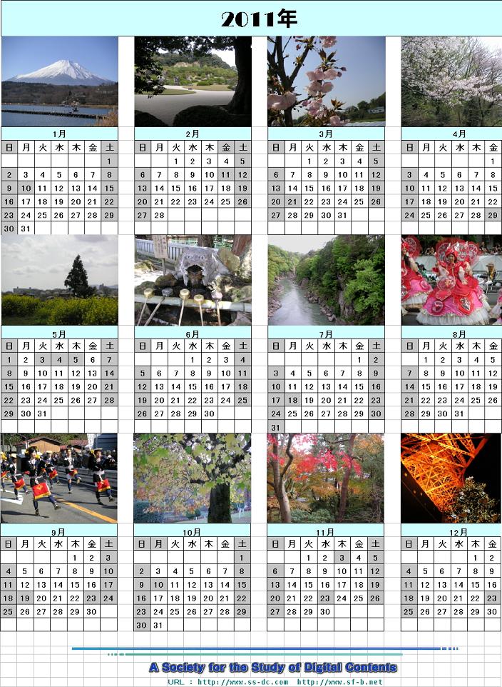 | 「未来カレンダー」で作った2011年度の月別カレンダーです。 ・「花カレンダー」と「風景カレンダー」があります。ダウンロードしてご活用ください。 ・表紙以外の写真は、自由に入れ替えができます(やり方は特集「未来カレンダー」を参照してください)。 ・カレンダーはエクセル形式で作成しています。ダウンロードをクリックしてください。 ・ダウンロードファイルは解凍してご使用ください。 ・著作権はデジタルコンテンツ研究会にありますので、他への無断転用はできません。 |