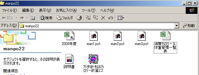 | 1)まずは、ダウンロード 下記のアドレスからダウンロードしてください。 http://web1.nazca.co.jp/tomato17/manpo.html/ 万歩計キロ&カロリー計算ソフト→ ダウンロード 2)ダウンロードしたファイルをダブルクリクして解凍してください。 3)manpo22のフォルダーができます。 ![]() 4)万歩計キロ&カロリー計算2.2をダブルクリックして起動します。 |